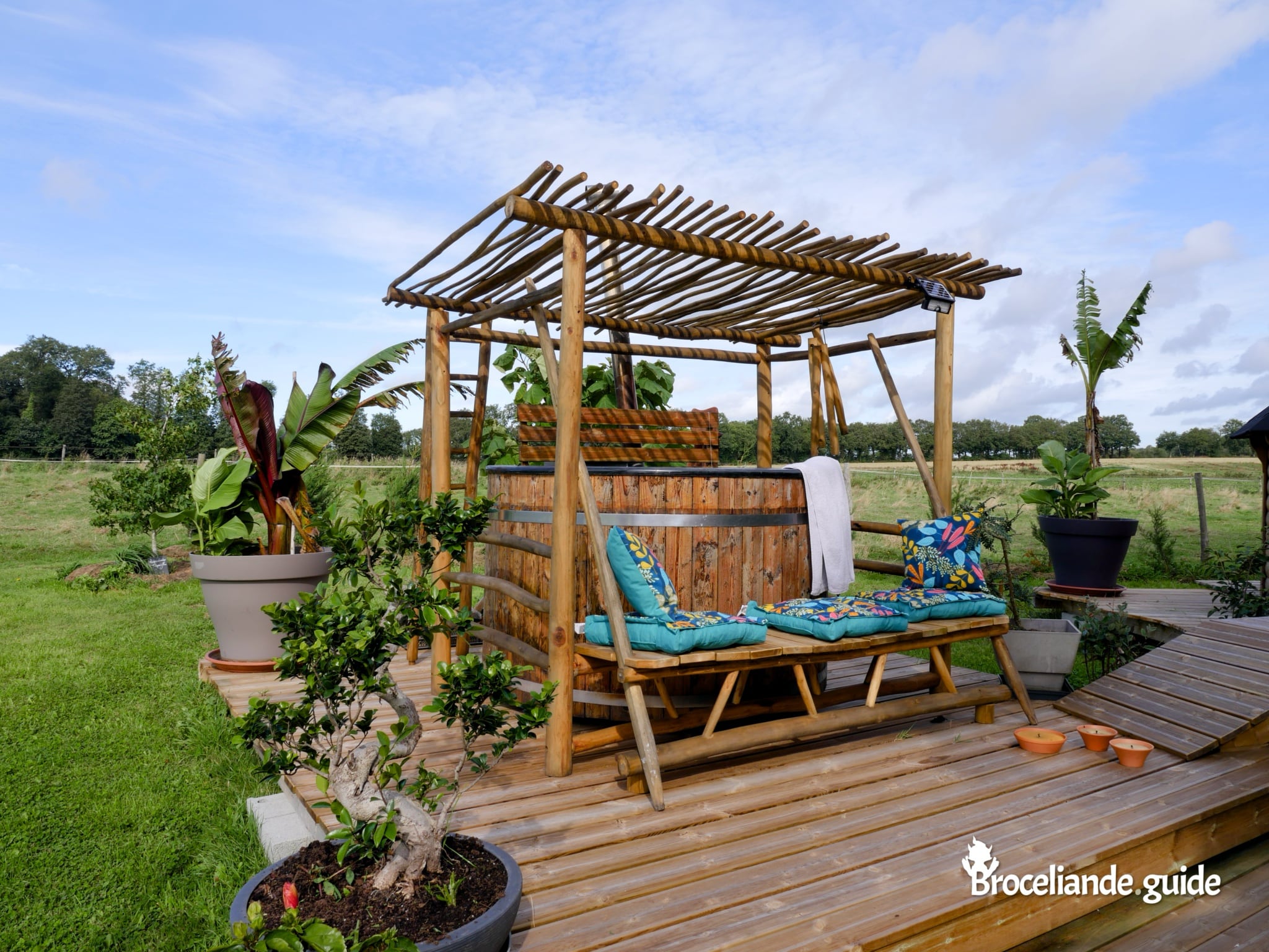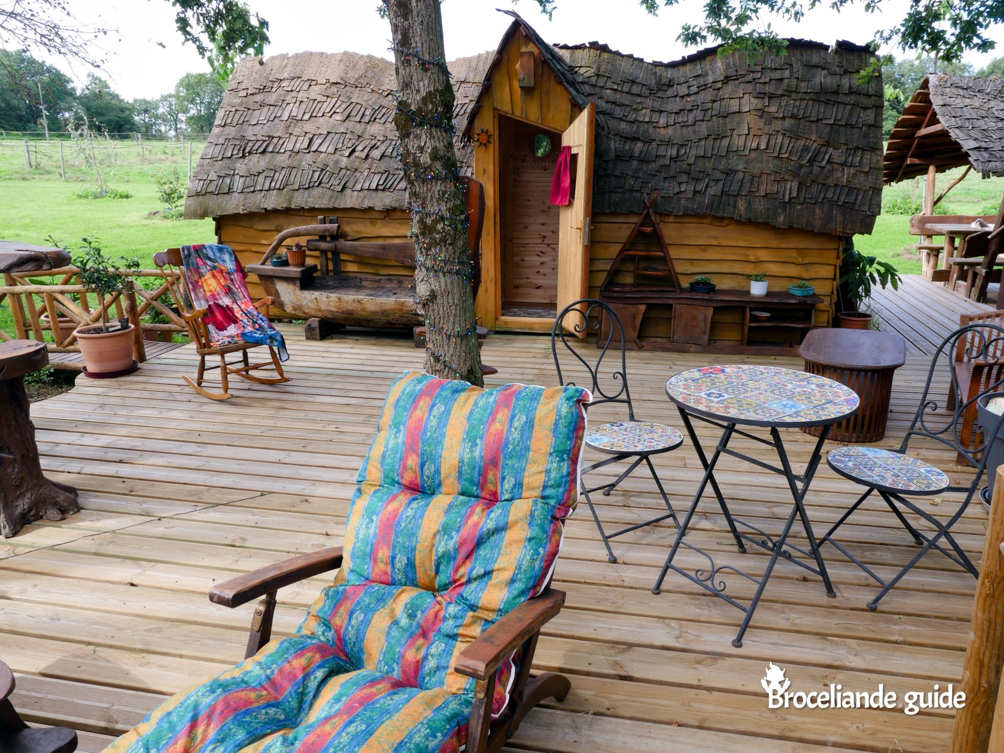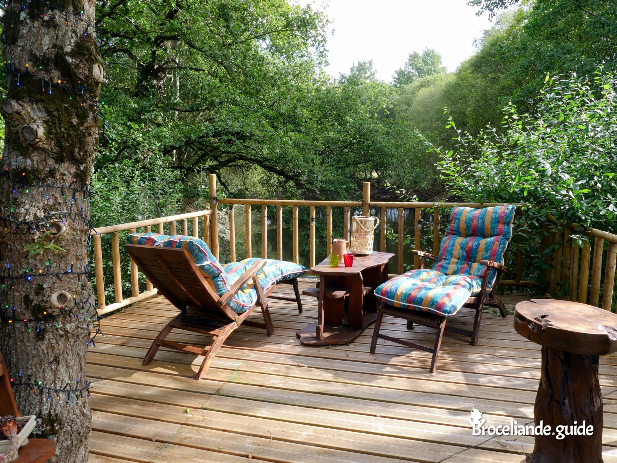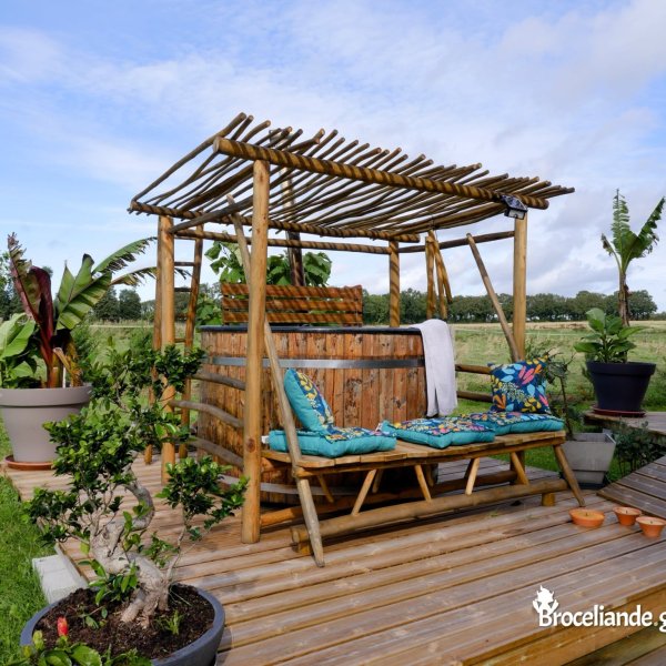 Une grande terrasse extérieure sur l’étang ombragé, avec un salon de jardin et des bains de soleil, vous permet de profiter du calme au bord de l’eau pour un séjour de détente en pleine nature. Le soir, guirlandes et lanternes illuminent la terrasse pour une ambiance hors du temps ;