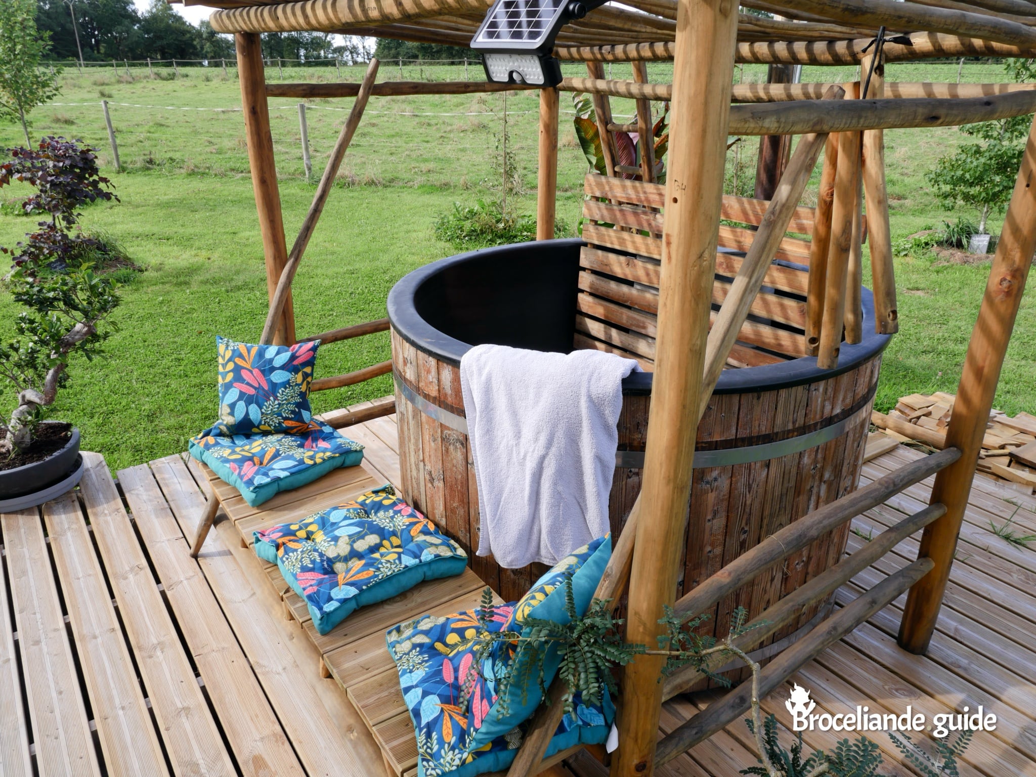 Bain nordique chauffé au feu de bois, à libre disposition (eau, bois et draps de bain fournis) ;